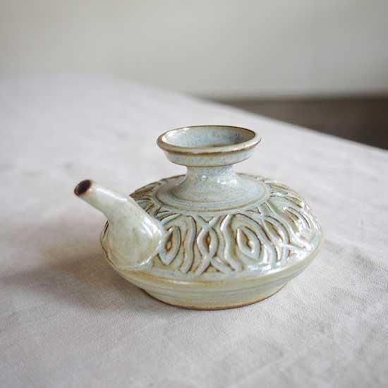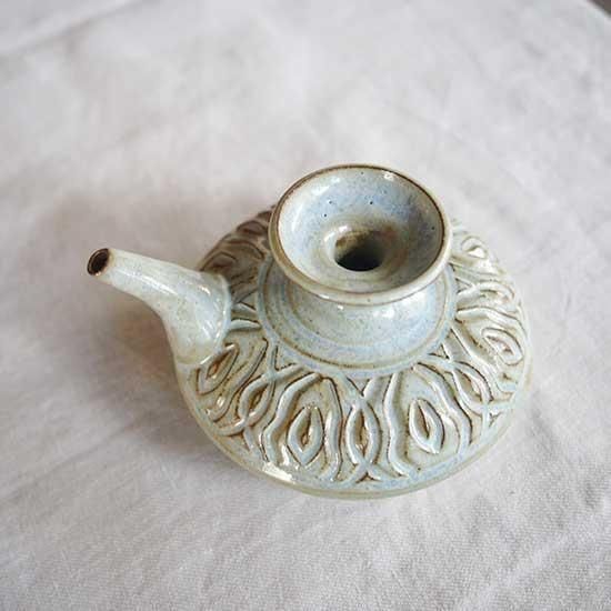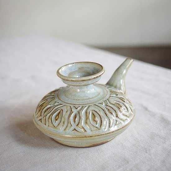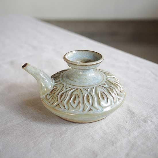 カラカラは沖縄で泡盛を楽しむための伝統的な酒器です。古典的なフォルムと金城さんならではの重なり合う釉薬の美しさ、1点毎に異なる線彫が魅力的です。