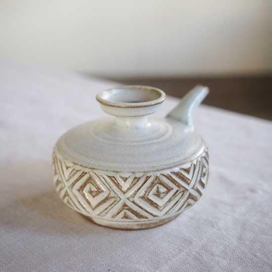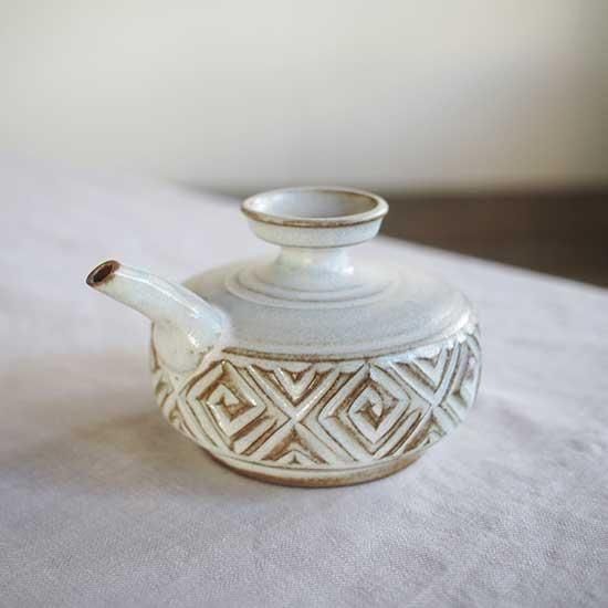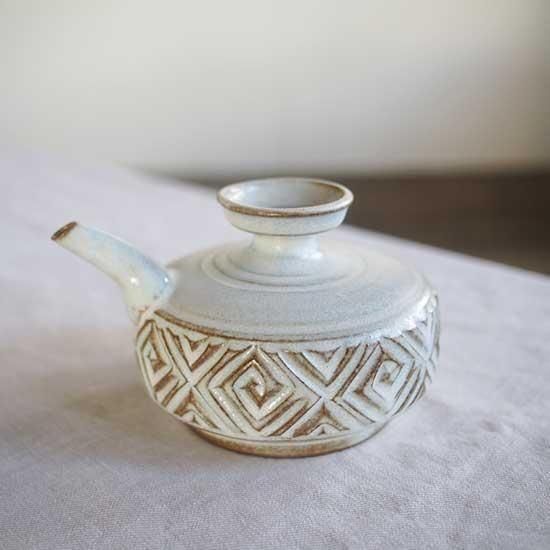 カラカラは沖縄で泡盛を楽しむための伝統的な酒器です。古典的なフォルムと金城さんならではの重なり合う釉薬の美しさ、1点毎に異なる線彫が魅力的です。