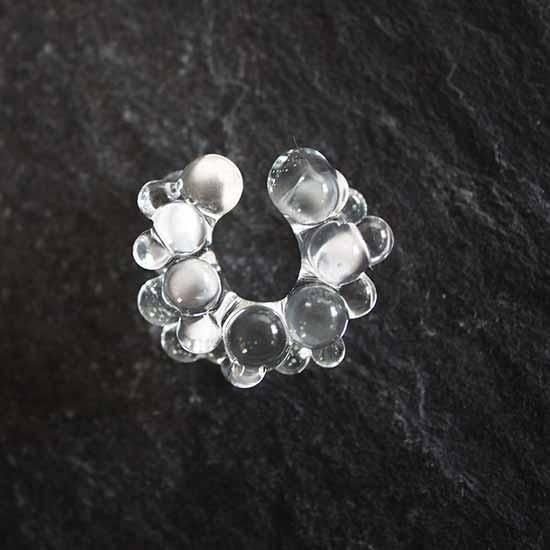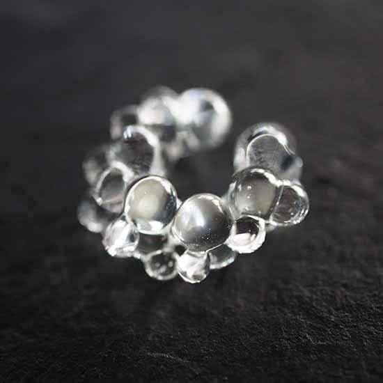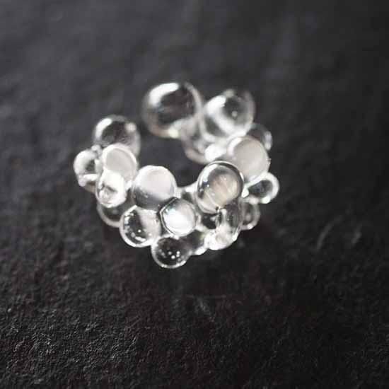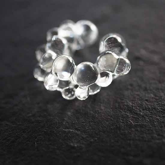 使われているホウケイ酸ガラスは衝撃に強い強化ガラス。その美しい透明感に反して、耐久性のある素材です。毎日使いたくなるガラスのジュエリーは様々なアクセサリーやお洋服との相性がよく、互いに引き立てあいます。