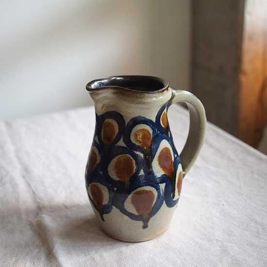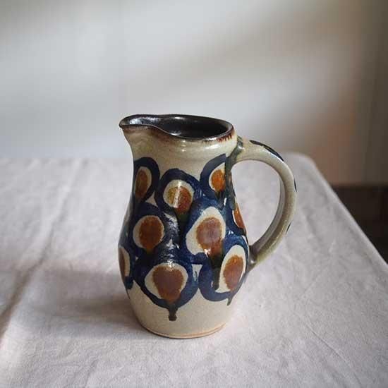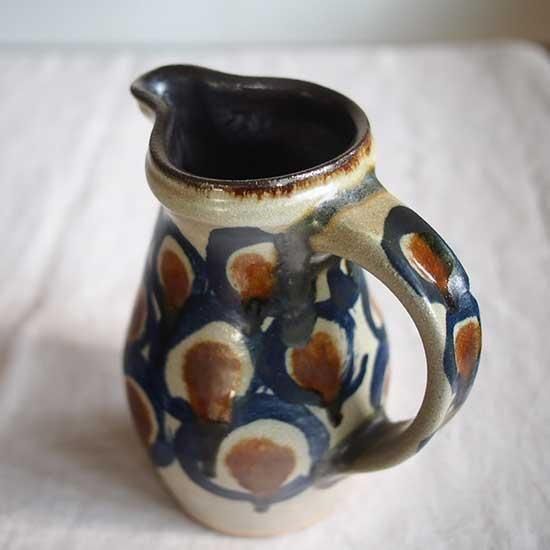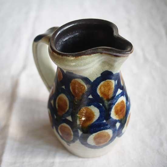 やちむんらしい丸紋がどこかポップで楽しい絵付けのピッチャーです。