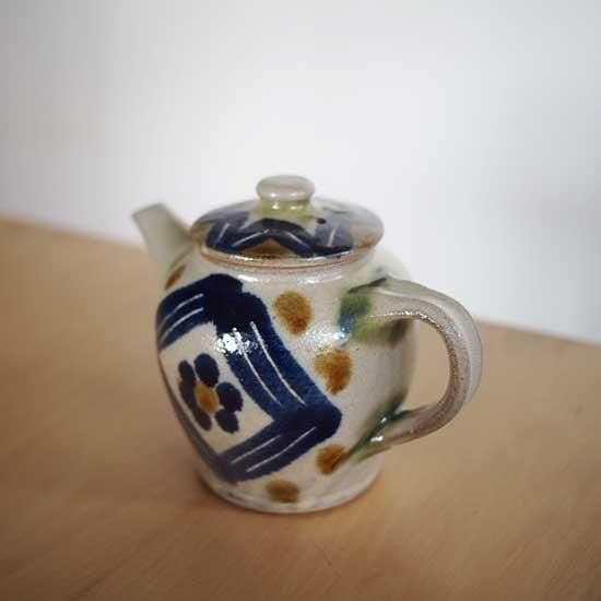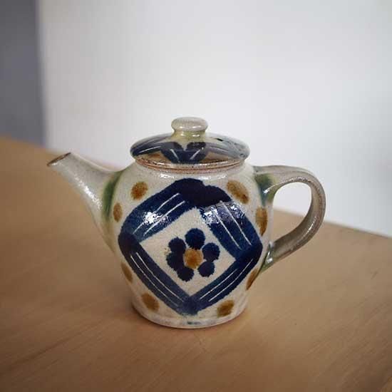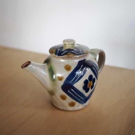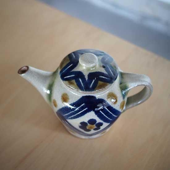 伝統的な花のような紋様が描かれた室生窯のポットです。愛らしい絵付けが素敵ですね。持ち手や、注ぎ口の細部が丁寧に作られています。