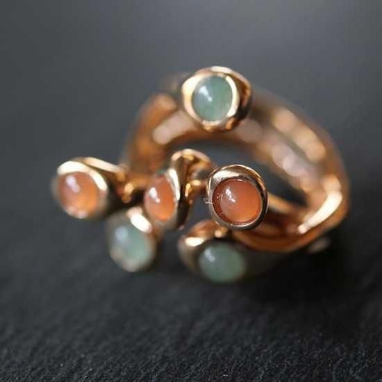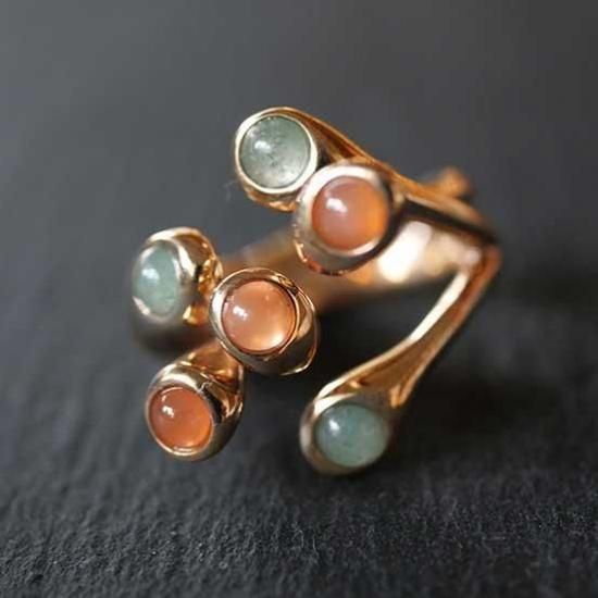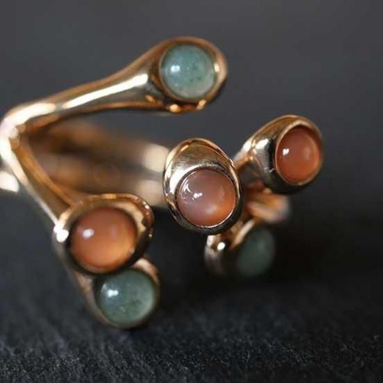 有機的な天然石の粒は角度により表情が変わり、指先にアクセントと華を添えてくれる魅力的なデザインです。ブロンズとの組み合わせは、あたたかな印象の天然石に上品な表情を与えてくれます。